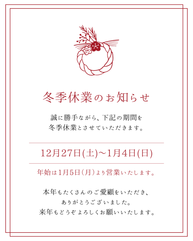 冬季休業中にホームページへ頂いたお問い合わせにつきましては、2025年1月6日(月)以降のご返答となります。